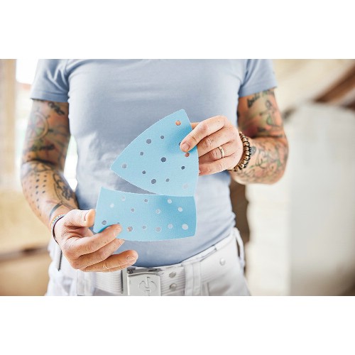 Allsidig sandpapir med StickFix borrelåsfeste. For sliping av tre, plast, mineralske materialer, akryl, sparkel, lakk m.m. Spesielt tilpasset for VOC-lakk og harde overflater. Slipekorn bestående av selvslipende keramisk materiale og stabilt aluminiumoksid for høy slipeevne og lang levetid. Med perforert design som reduserer forbruket av slipepapir, riv av spissen ved perforeringen, snu den og fortsett slipingen. Med 27 hull for ekstra god luftgjennomstrømning. Passer til Festool Deltaslip DTSC 200.