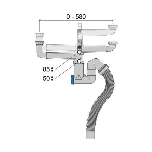 Mycket flexibelt diskbänksvattenlås för installation i kök, tvättstuga och städutrymme. Vattenlåset kan anslutas mot diskho, tvättbänk och utslagsvask. Går att ansluta mot golv eller vägg. Tack vare vattenlåsets flexibilitet går det att placera längst in i skåpet vilket därmed ger plats för källsortering eller liknande. Avstånd mellan anslutningar uppåt kan variera upp till 580 mm i sidled och 130 mm i höjdled. Vid behov kan armarna byta plats och även kapas för maximal flexibilitet.